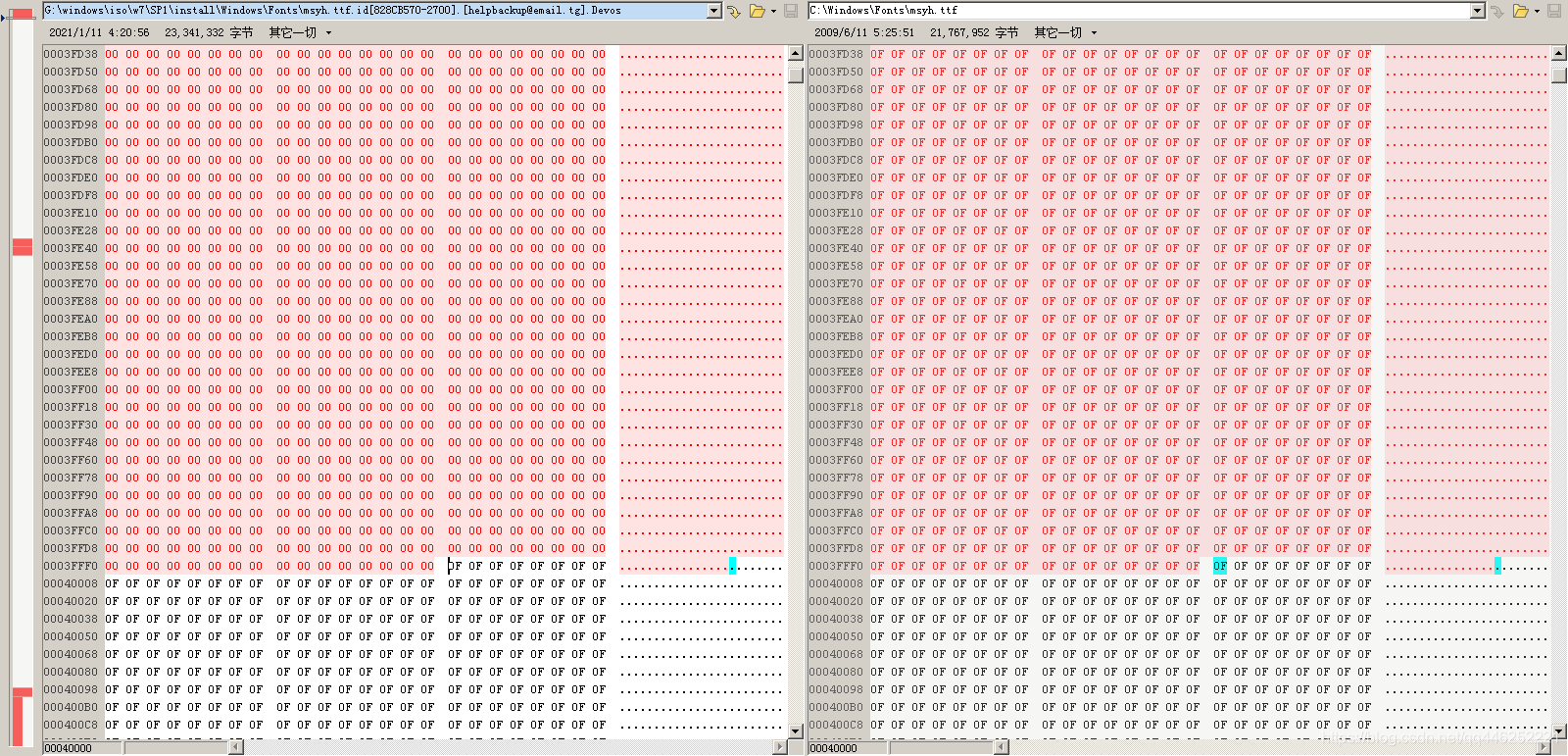 再找一个比较大一点的文件 ,这个文件有20MB。 发现文件前面256KB的内容全变为了00,中间也有一段变为了00,末尾又有一段全为00的数据, 而其余部分的内容并没有改变?嘻嘻,这样的话似乎还能还原一小部分文件内容? 在末尾又新增加了一段数据,猜测是变为了00的这三段数据加密后的内容。