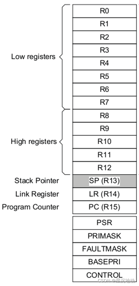 SP背后有2个物理寄存器MSP和PSP,上电默认MSP。 可以用CONTROL寄存器来选择使用MSP或PSP。 Cortex-M使用的是满递减栈。