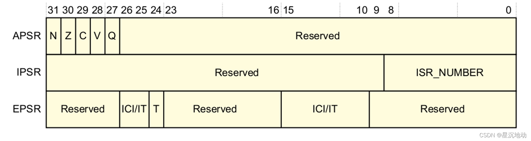 NZCVQ分别表示负数、零、进位或借位、溢出、DSP溢出或饱和标志位。 ISR_NUMBER表示当前的运行的是哪个中断,0表示在主线程模式。 ICI 可中断后继续运行的指令状态,IT指示IT指令的状态,T指示Thumb指令模式。