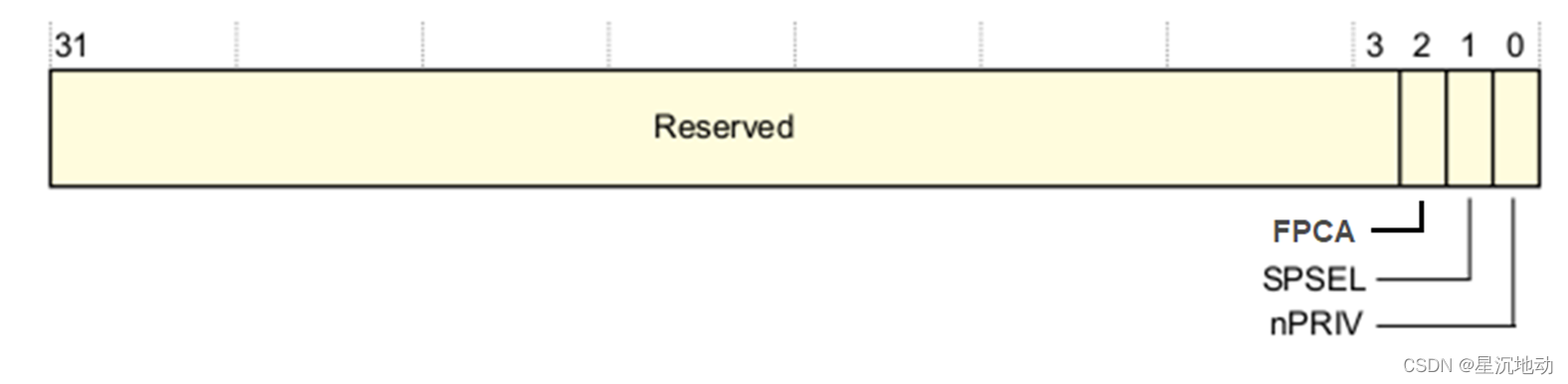 FPCA指示当前FPU状态,1=FPU使用中,0=FPU未使用 SPSEL指示当前SP用的是哪个,1=PSP,0=MSP nPRIV指示当前特权等级,1=非特权模式,0=特权模式