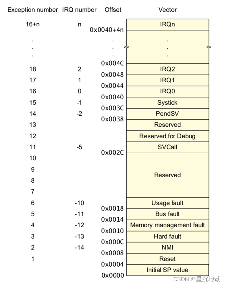 这是Cortex-M3手册里面截取出来的中断向量表: