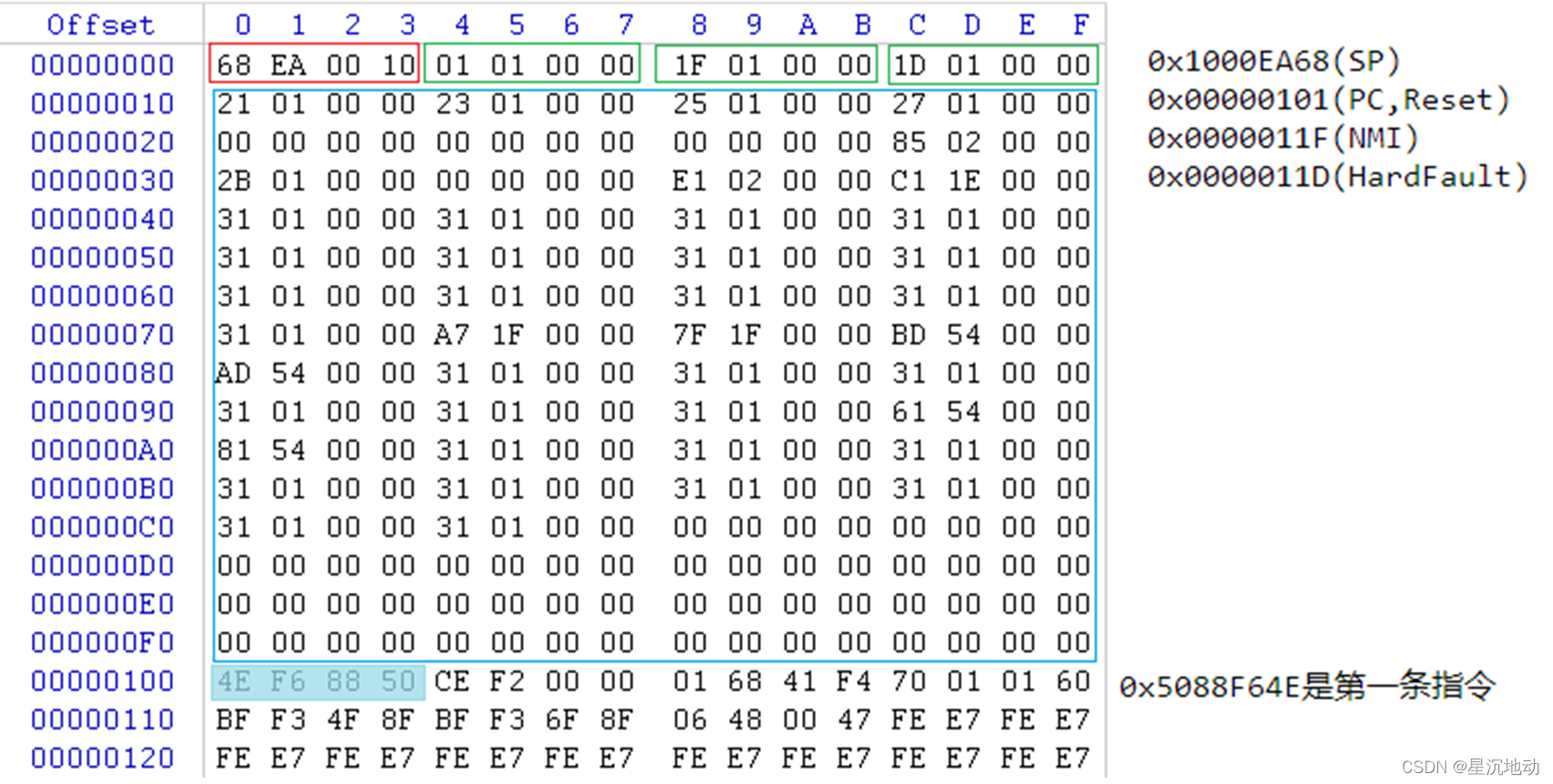 因为Cortex-M一般是小端格式,所以每4个字节要倒过来。 前4个字节就是0x1000EA68,它表示上电后的SP值。 接下来4个字节是0x00000101,它表示ResetHandler,它表示上电后的PC值。 PC=0x00000101,所对应的第一条指令就是0x5088F64E。