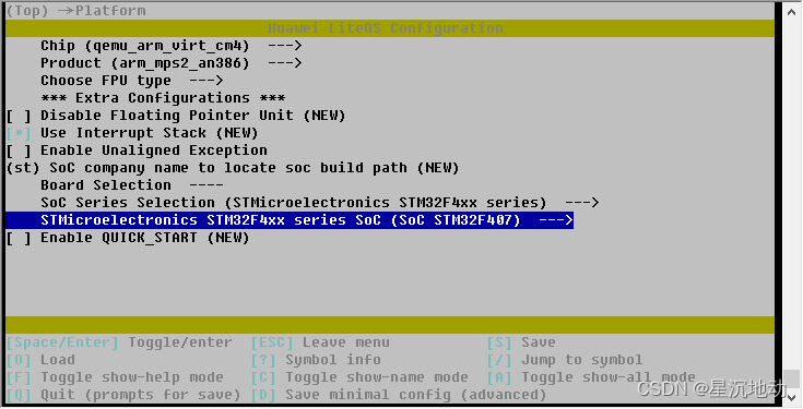 Kconfig.liteos_m.soc会在菜单里添加st这个SOC_COMPANY 还会扫描子目录下的Kconfig.liteos_m.soc, 在stm32f4xx子目录下面的这个文件又向菜单添加SOC_STM32F407