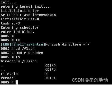 写完代码,按照之前的方法修改BUILD.gn,一切顺利的话编译通过。 下载到板子,可以看到LittlefsInit ret=0的日志。 敲ls命令,会报错,但是cd /flash切换目录后就没有问题了。