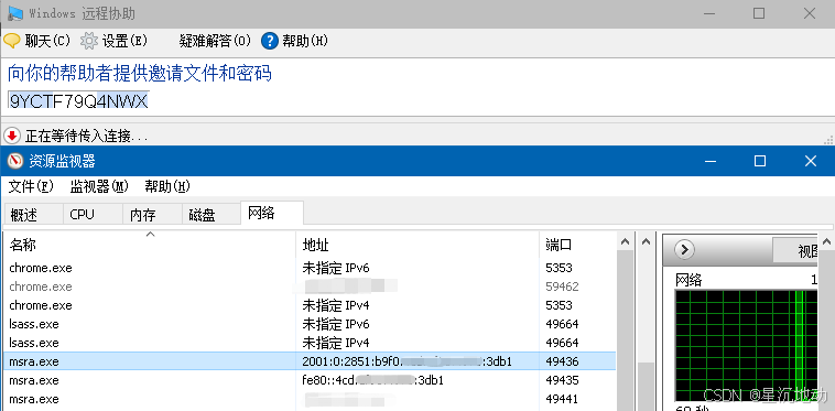 继续研究发现远程协助的进程msra.exe监听的端口是随机的,但可以看到监听了一个IPv6地址。 2台电脑连接时,可以互相看到msra.exer是通过IPv6的地址连接的。