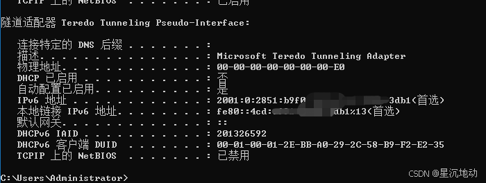 执行这个命令后:查看ipconfig /all就能找到隧道IPv6的地址了。